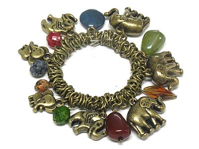 Metal elephant and natural bead charms stretch bracelet