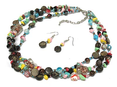 WHOLESALE WOOD AND ART BEAD 3 ROW NECKLACE AND EARRING SET 333055