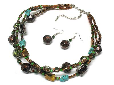 WHOLESALE TURQUOISE AND PATINA BEAD MULTI STRANDS NECKLACE AND EARRING SET 333134