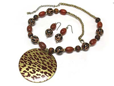 Animal printed large round disk pendant and multi beads strand necklace and earring set