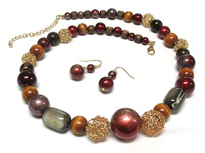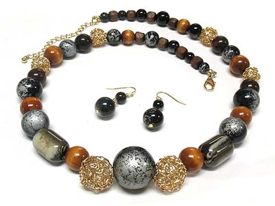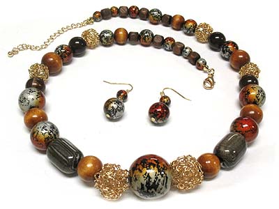 WHOLESALE MULTI GRADATION PATINA AND WIRED BALL AND WOOD BEAD NECKLACE AND EARRING SET 334303