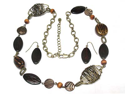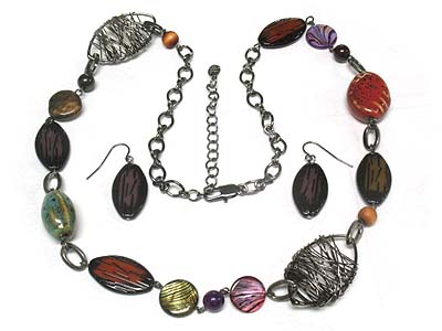 Wired metal oval frame and germstone necklace and earring set