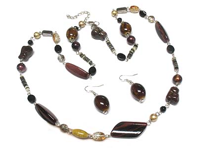 WHOLESALE MULTI GLASS BEAD AND GERM STONE AND WOOD NECKLACE AND EARRING SET 334872
