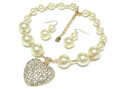 WHOLESALE CRYSTAL STUD HEART PENDANT AND MULTI SIZE PEARL BEADS STRAND NECKLACE AND EARRING SET 335111