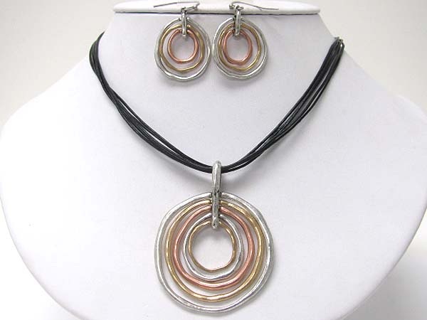 WHOLESALE MULTI TONE AND SIZE CIRCLE FRAME PENDANT CORDS NECKLACE AND EARRING SET 335342