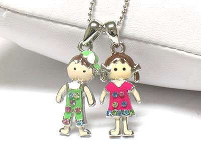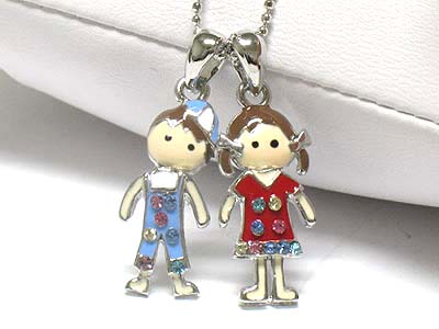 WHOLESALE MADE IN KOREA WHITEGOLD PLATING CRYSTAL AND ENAMELED NODDING HEAD SMALL BOY AND GIRL NECKLACE 335367