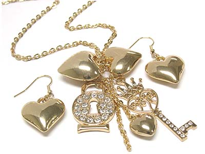 WHOLESALE CRYSTAL PADLOCK AND KEY AND HEART LONG NECKLACE AND EARRING SET 335549