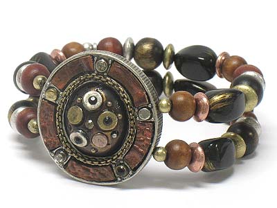 WHOLESALE ANTIQUE STYLE CRYSTAL STUD ROUND METAL AND MULTI WOOD BEADS DOUBLE LINE ELASTIC BRACELET 335643