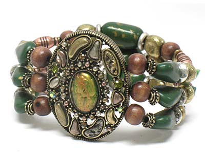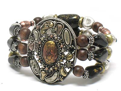 Antique style crystal stud casting oval metal and multi wood and metal beads deco triple line elastic bracelet