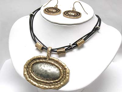 WHOLESALE ANTIQUE BURNISH METAL PENDANT AND CORD NECKLACE AND EARRING SET 336194