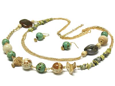 WHOLESALE MULTI SHAPE NATURAL STONE DECO DOUBLE STRAND LONG NECKLACE AND EARRING SET 336392
