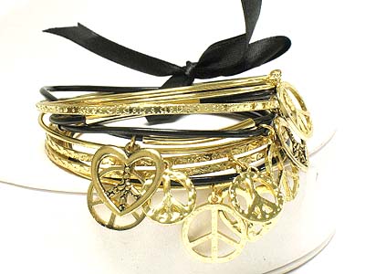 WHOLESALE MULTI PEACE PATTERN CHARM CORDS AND METAL BANGLE WITH RIBBON 336697