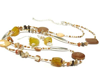WHOLESALE NATURAL STONE AND METAL AND CHIP STONE LINK SEED BEADS LONG NECKLACE AND EARRING SET 336701