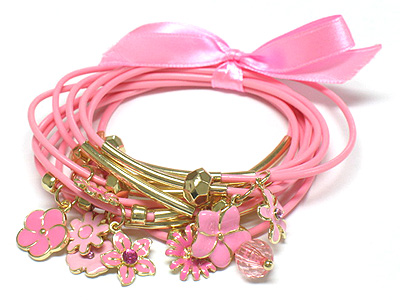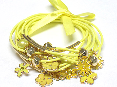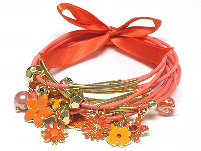 Flower charms dangle ribbon tied multi cord bracelet