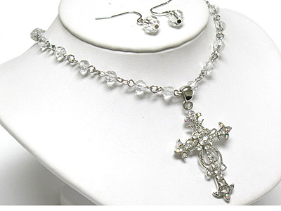 Crystal cross pendant and beads chain necklace and earring set