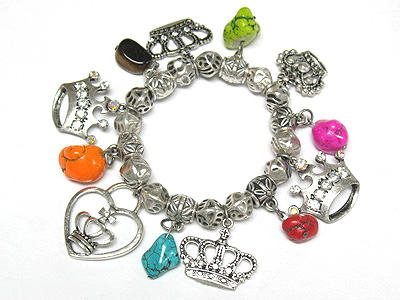 WHOLESALE TURQUOISE STONE AND CROWN CHARM DANGLE STRETCH BRACELET 338233