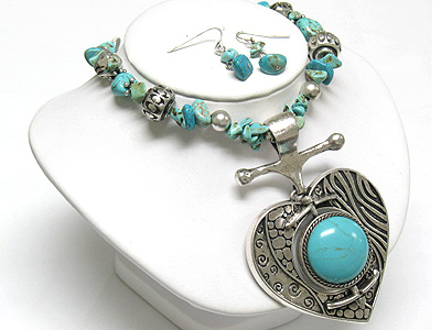 WHOLESALE ANTIQUE STYLE HEART PENDANT TURQUOISE STONE NECKLACE AND EARRING SET 338398
