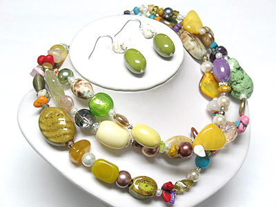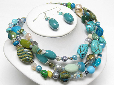 WHOLESALE TRIPLE LAYER GENUINE STONE AND MULTI BEADS NECKLACE AND EARRING SET 338571
