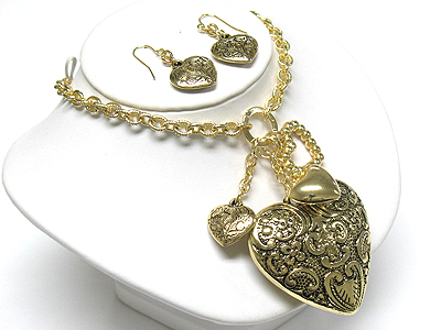 Metal filigree heart y drop necklace and earring set