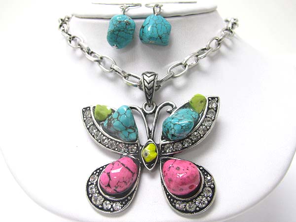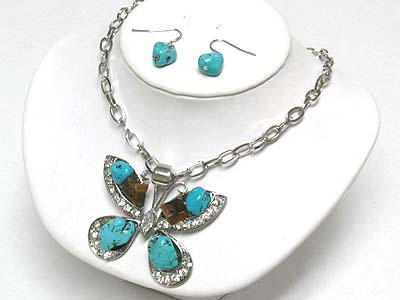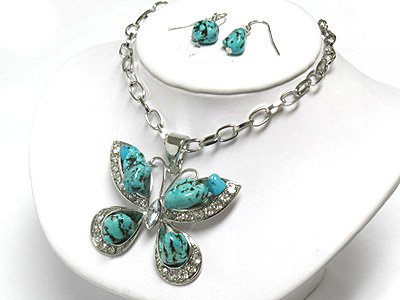 WHOLESALE TURQUOISE AND NATURAL MATERIAL BUTTERFLY NECKLACE AND EARRING SET 338889