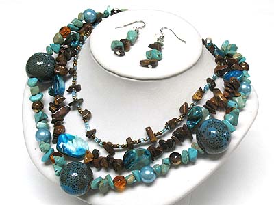 WHOLESALE MULTI STRAND NATURAL STONE AND CERAMIC BALL LINK NECKLACE AND EARRING SET 339959