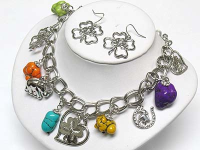 Multi color genuine stone and charm dangle chain necklace and earring set
