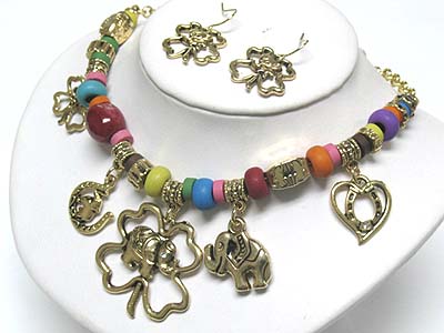 WHOLESALE MULTI COLOR GENUINE STONE AND CHARM DANGLE CHAIN NECKLACE AND EARRING SET 340138