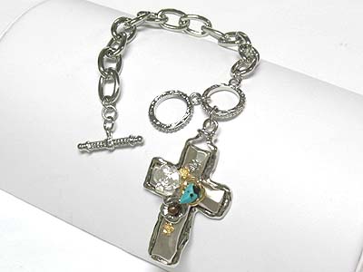 WHOLESALE NATURAL CHIP STONE DECO METAL CROSS CHARM TOGGLE BRACELET 340385