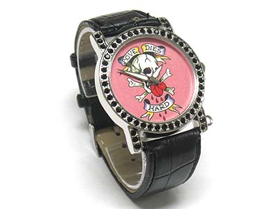 Skull theme crystal frame round face leather band watch