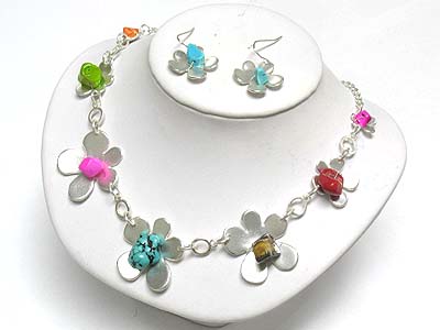 Turquoise stone metal flower link necklace and earring set