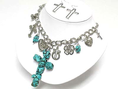 WHOLESALE NATURAL STONE CROSS PENDANT DANGLE NECKLACE AND EARRING SET 341039