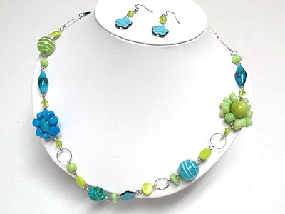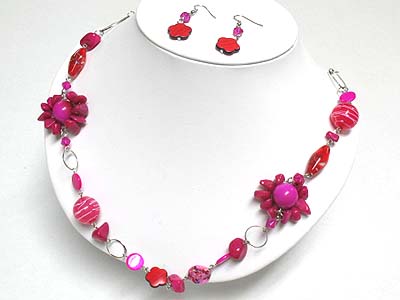 WHOLESALE FLOWER ACCENT NATURAL STONE AND MULTI BEADS NECKLACE AND EARRING SET 341272