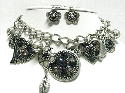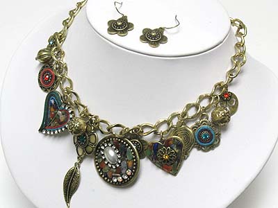 Antique style natural stone and crystal deco charm dangle neckalce and earring set