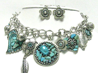 WHOLESALE ANTIQUE STYLE NATURAL STONE AND CRYSTAL DECO CHARM DANGLE NECKALCE AND EARRING SET 341957