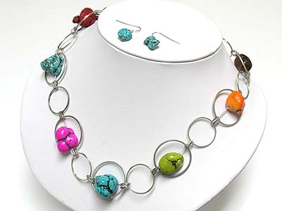 WHOLESALE TURQUOISE STONE AND METAL ROUND LINK NECKLACE AND EARRING SET 342142