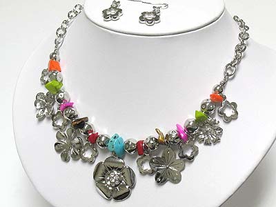 Natural chip stone and metal flower dangle necklace and earring set