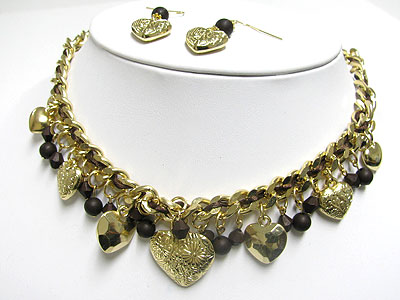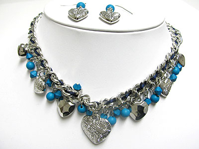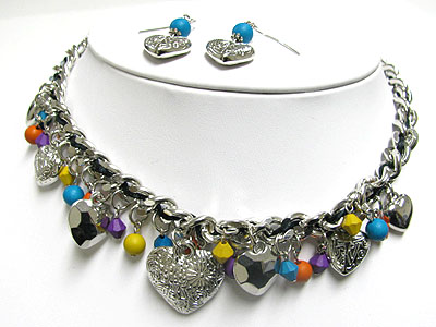 Metal heart and beads drop chain necklace and earring set