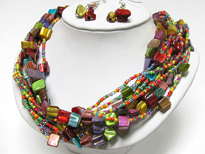 WHOLESALE MULTI LAYER SHELL CUBE AND SEED BEADS NECKLACE AND EARRING SET 343339