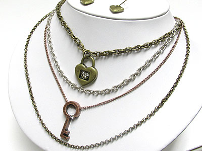 WHOLESALE EUROPEAN STYLE MULTI LAYER TRI TONE KEY AND LOCK CHARM LONG NECKLACE AND EARRING SET 343710