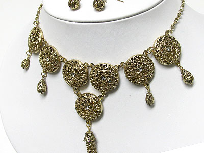 WHOLESALE FILIGREE ROUND METAL DISK AND LONG TASSEL DROP NECKLACE AND EARRING SET 343873