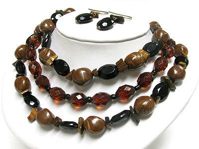 Triple layer animal pattern marblic and glass beads necklace earring set