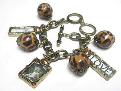 Animal pattern wooden ball and photo frame charm dangle bracelet