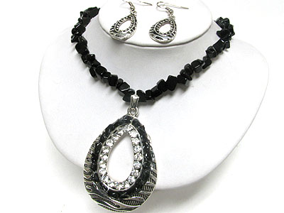 Crystal line metal oval pendant natural chip stone necklace earring set