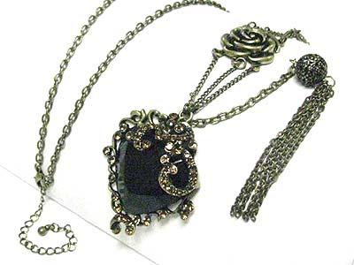 WHOLESALE BURNISH METAL FLOWER AND CRYSTAL DECO STONE DROP LONG NECKLACE 346096
