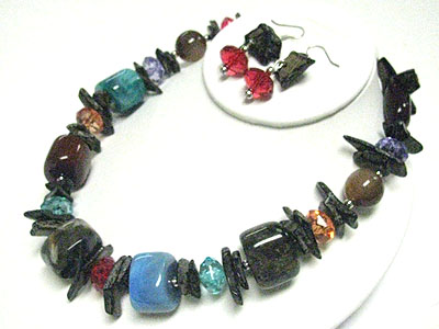 WHOLESALE NATURAL CHIP STONE AND CERAMIC CUBE NECKLACE EARRING SET 346155