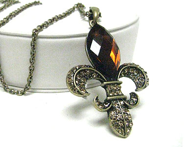 Vintage style burnish metal crystal fleur de lis pendant long necklace