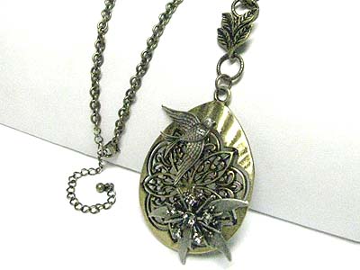 WHOLESALE BURNISH METAL FLOWER AND BIRD OVAL PENDANT LONG NECKLACE 346433