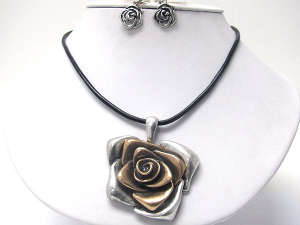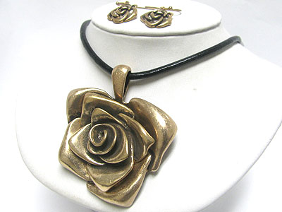 WHOLESALE BURNISH METAL FLOWER PENDANT CORD NECKLACE EARRING SET 346615