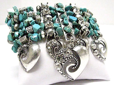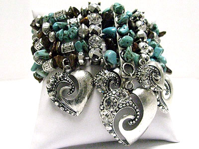 Heart charm multi row natural chip stone stretch bracelet