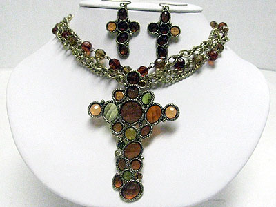 Facet glass stone deco large cross pendant and braided chain necklace set